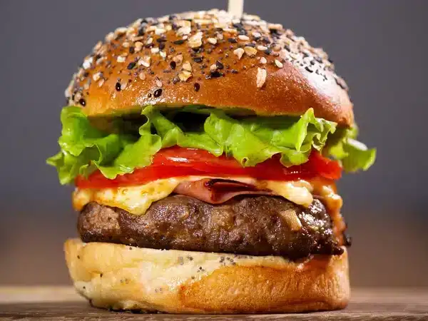 Pan artesanal , 100 gr de carne de la casa, Lechuga crespa, Tomate, cebolla y Queso.